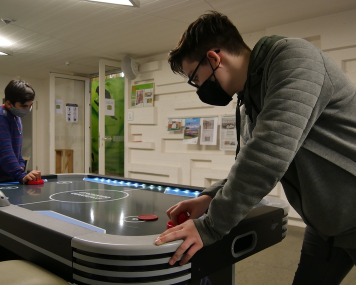 Im kom,ma ist es zurzeit laut. Hallende Geräusche sind bis in den Saal des Jugendzentrums zu hören. Plastik trifft auf Plastik, Puck trifft auf Bande, begleitet von kleinen blinkenden Lichtern an der Seite. „Treffer!“, schreit Ahmad, ein strammer Schuss ins gerade mal 1 Zentimeter hohe und 26 Zentimeter breite Tor. Der Spielstand wurde auf 3:1 erhöht. Doch es dauert nicht lange bis sein Gegenspieler den Puck auf seiner Spielhälfte platziert und schießt. Gerade noch abgewehrt, die rote Scheibe schnellt zurück. 9 Punkte gilt es zu holen, der Siegeswille ist beiden ins Gesicht geschrieben.